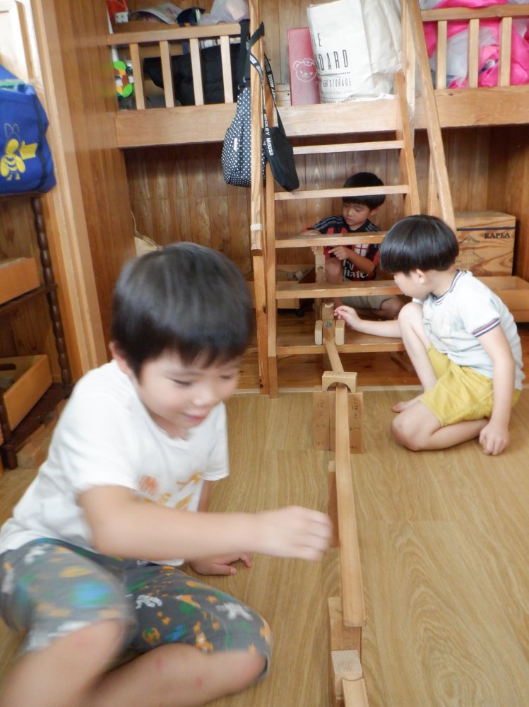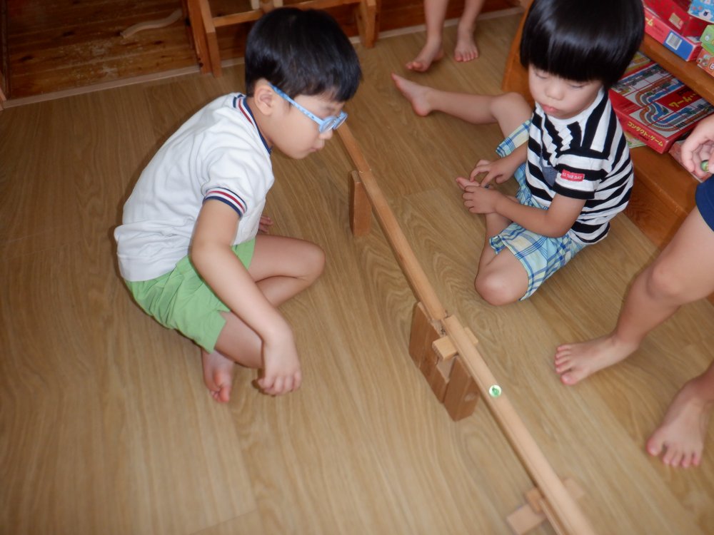 積み木コーナーでビー玉を転がす