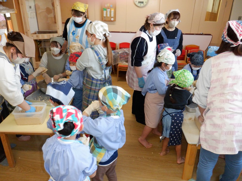 大豆を潰して手で丸め、お団子にしました。
